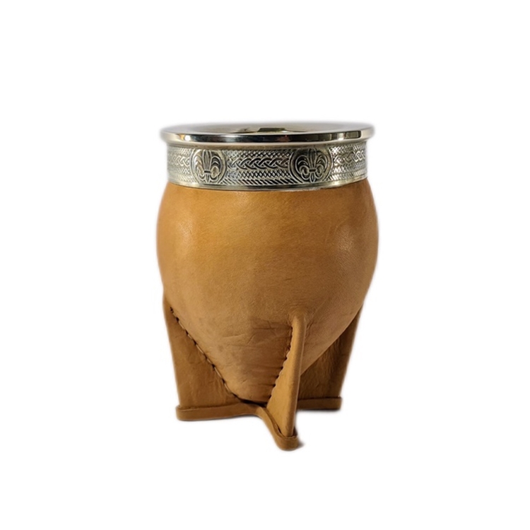 Top of the range in the mate segment. Gourd selected with nickel silver and cowhide leather. Handmade with reinforced Uruguayan style stitching. Four supports for a precise balance. Each mate is unique and has particular characteristics.
